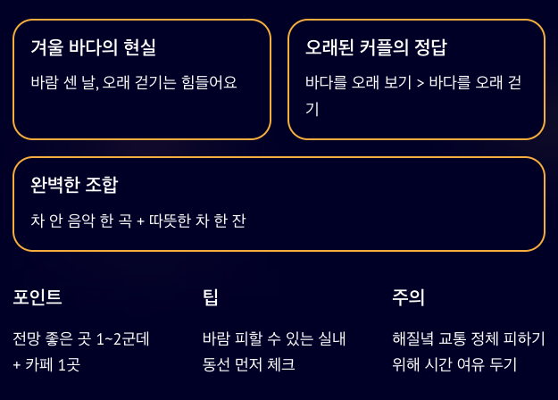 바다는 늘 정답 같지만, 겨울이나 바람 센 날에는 걷는 게 생각보다 힘들 수 있어요. 오래된 커플 여행이라면 ‘바다를 오래 걷기’보다 ‘바다를 오래 보기’가 더 낫습니다. 차 안에서 음악 한 곡 듣고, 따뜻한 차 한 잔 마시고, 그걸로 충분해요.