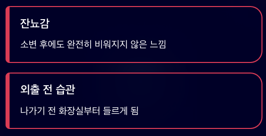 - 소변을 본 뒤에도 완전히 비워지지 않은 듯한 잔뇨감이 남습니다