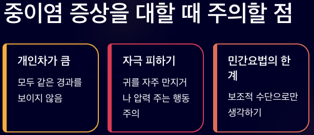 중이염 증상이 있다고 해서 모두 같은 경과를 보이는 것은 아니며, 개인차가 큽니다. 귀를 자주 만지거나 무리하게 압력을 주는 행동은 오히려 자극이 될 수 있어 주의가 필요합니다. 민간요법이나 자가 관리 방법은 보조적인 수단으로만 생각하는 것이 좋다고 알려져 있습니다.