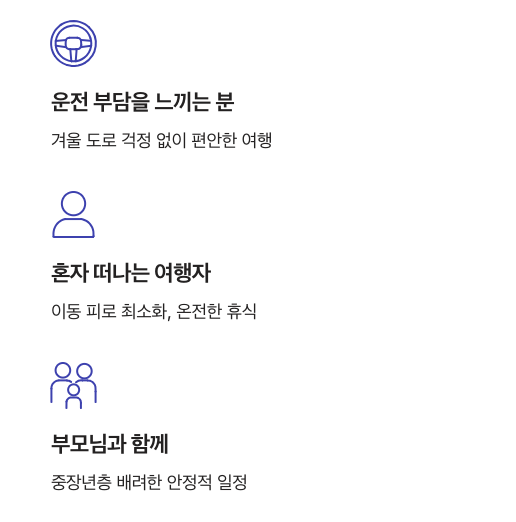 겨울에는 이동 시간이 길어질수록 체력 소모가 빠르게 늘어납니다. 운전에 집중하다 보면 풍경이나 분위기를 즐길 여유도 줄어듭니다. 여러 자료에서 공통적으로 언급되는 내용은 여행 만족도를 좌우하는 요소 중 하나가 이동의 안정감이라는 점입니다. 그래서 겨울 여행에서는 목적지보다 이동 방식이 더 중요해집니다.