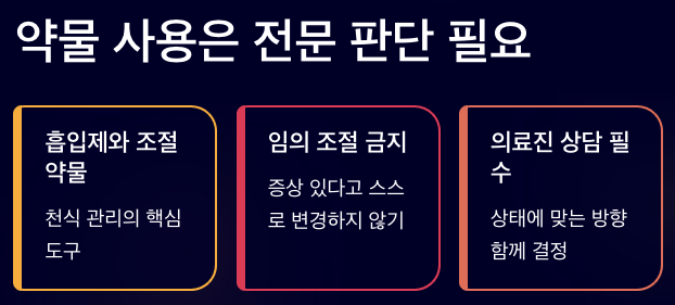 천식 치료법에서 흡입제나 조절 약물 이야기를 빼놓을 수는 없습니다. 다만 증상이 있다고 해서 임의로 사용량을 조절하기보다는 의료진과의 상담을 통해 상태에 맞는 방향을 정하는 것이 일반적입니다.