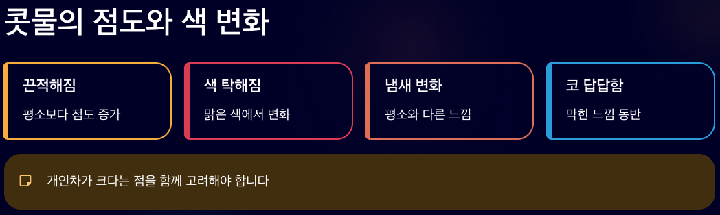 축농증 증상이 이어지면 콧물이 끈적해지거나 색이 탁해졌다고 느끼는 경우가 있습니다. 평소와 다른 냄새가 느껴지거나 코 안이 답답한 느낌이 동반되기도 합니다. 다만 이런 변화는 개인차가 크다는 점을 함께 고려해야 합니다.