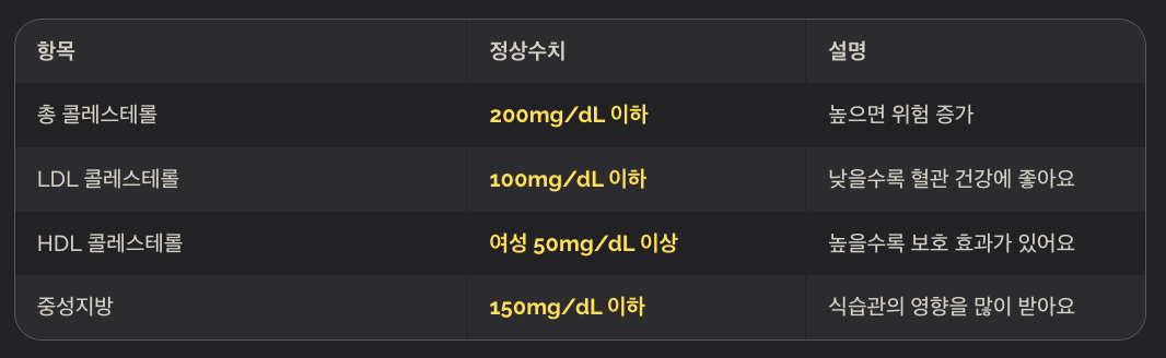 | 총 콜레스테롤 | 200mg/dL 이하 | 높으면 위험 증가 |