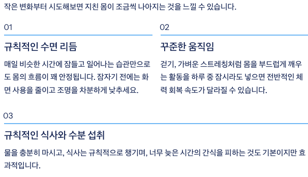 작은 변화부터 시도해보면 지친 몸이 조금씩 나아지는 것을 느낄 수 있습니다. 먼저 규칙적인 수면 리듬을 만드는 것이 중요한데, 매일 비슷한 시간에 잠들고 일어나는 습관만으로도 몸의 흐름이 꽤 안정됩니다. 잠자기 전에는 화면 사용을 줄이고 조명을 차분하게 낮추면 더 편안하게 잠들 수 있어요.