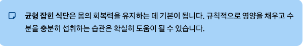 또한 가볍게라도 꾸준히 움직이는 것이 도움이 될 수 있습니다. 걷기, 가벼운 스트레칭처럼 몸을 부드럽게 깨우는 활동을 하루 중 잠시라도 넣으면 전반적인 체력 회복 속도가 달라질 수 있습니다. 물을 충분히 마시고, 식사는 규칙적으로 챙기며, 너무 늦은 시간의 간식을 피하는 것도 기본이지만 효과적입니다.