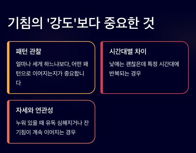 예를 들어 낮에는 괜찮은데 특정 시간대에 반복되거나, 누워 있을 때 유독 심해지는 경우도 있고, 특별한 통증은 없는데 잔기침처럼 계속 이어지는 경우도 있습니다.