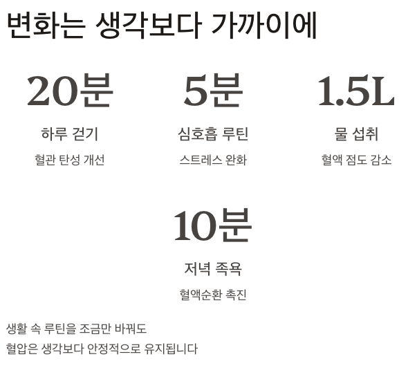 이 루틴은 다음날 아침 혈압의 안정성과도 연결되기 때문에 꾸준히 실천하면 확실한 차이를 느끼실 수 있어요.