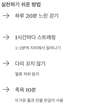 - 다리를 꼬고 앉지 않기(혈류 저하 방지)